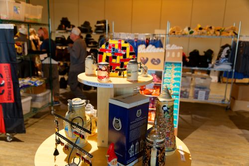 For sale are German gifts, souvenir T-shirts, flowered headbands, and authentic German-made beer steins. Credit card machines available for purchases. Returning this year, is a special booth outside selling the flowered headbands, included ones that light up!